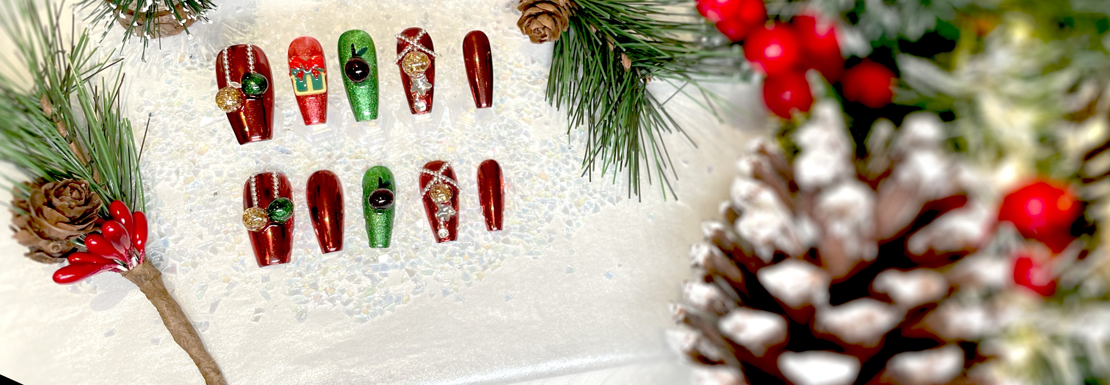 137 Rose bouquet green diamond handmade 3D Press On Nails