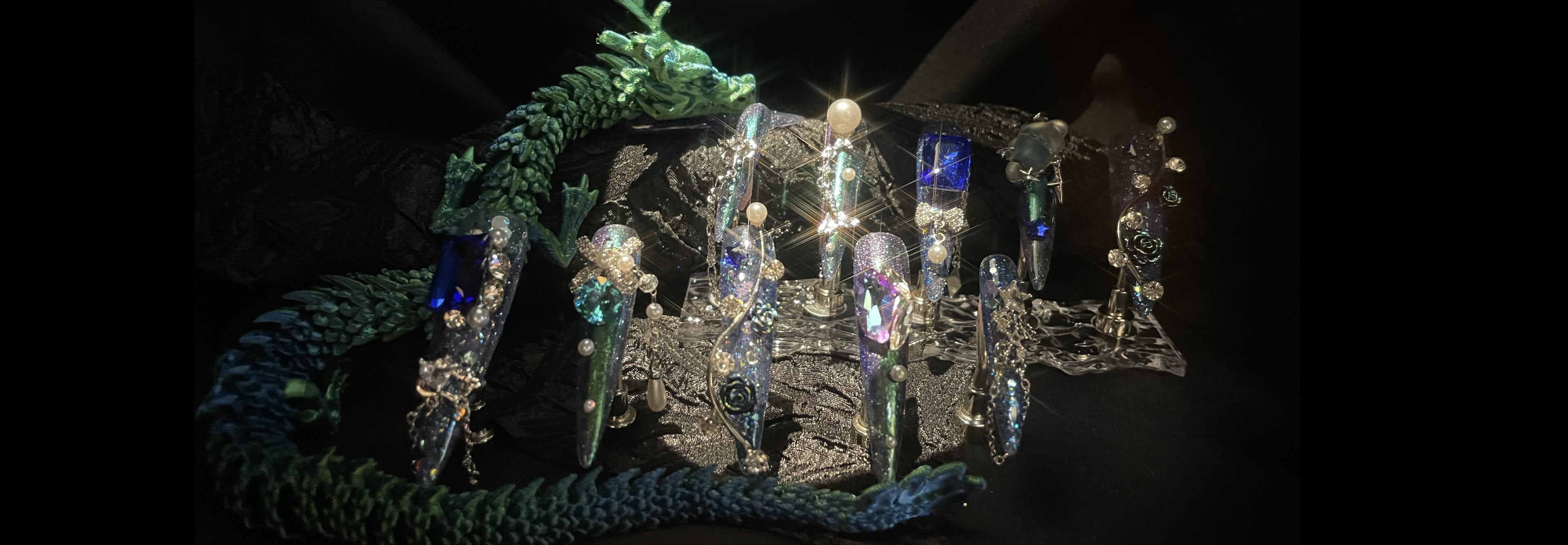 244 Oriental blue 3D printed dragon pearl chained diamond handmade Press On Nails