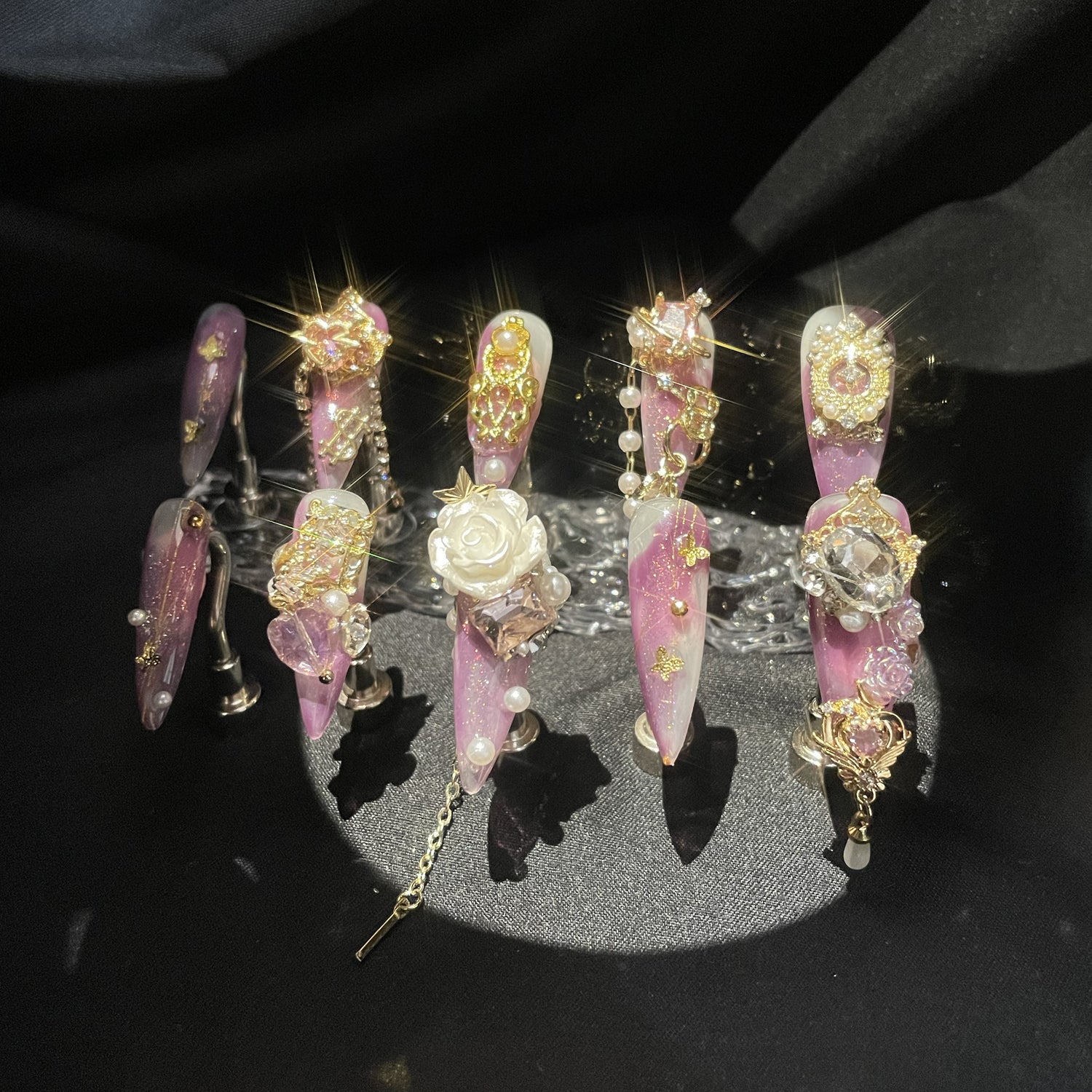 215 Luxury giant purple butterfly small pearls chain corss giant diamonds handmade 3D Press On Nails