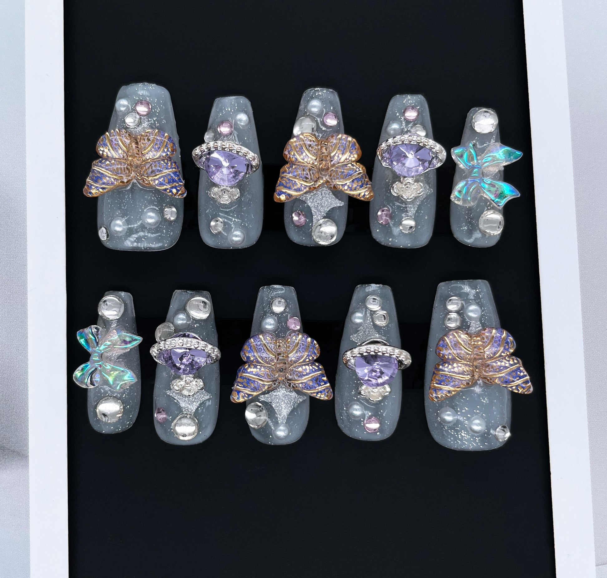 232 Starry frost transparent colorful butterfly diamond handmade 3D Press On Nails