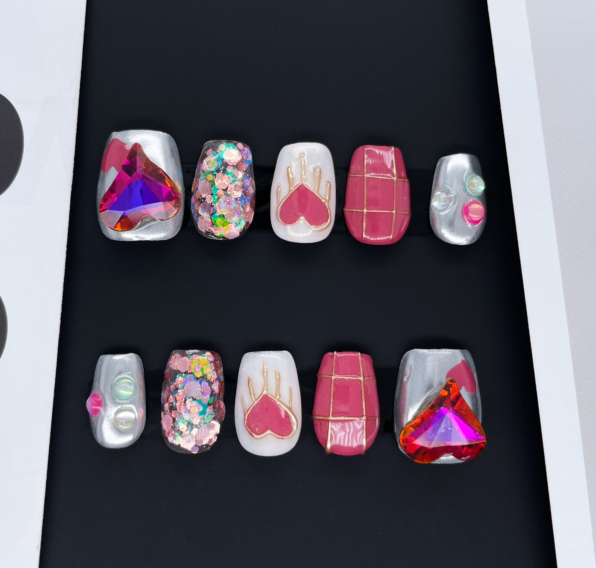 223 Sweet pink heart shape giant diamond metal silver handmade 3D Press On Nails