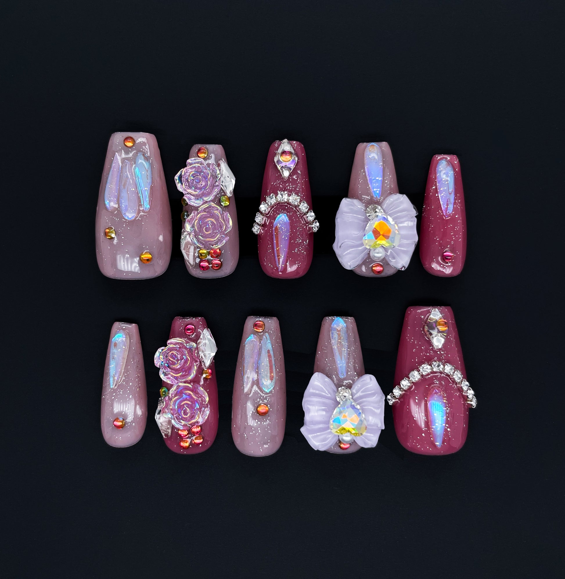 222 Sweet pink rose huge bow diamond chain pearl handmade 3D Press On Nails
