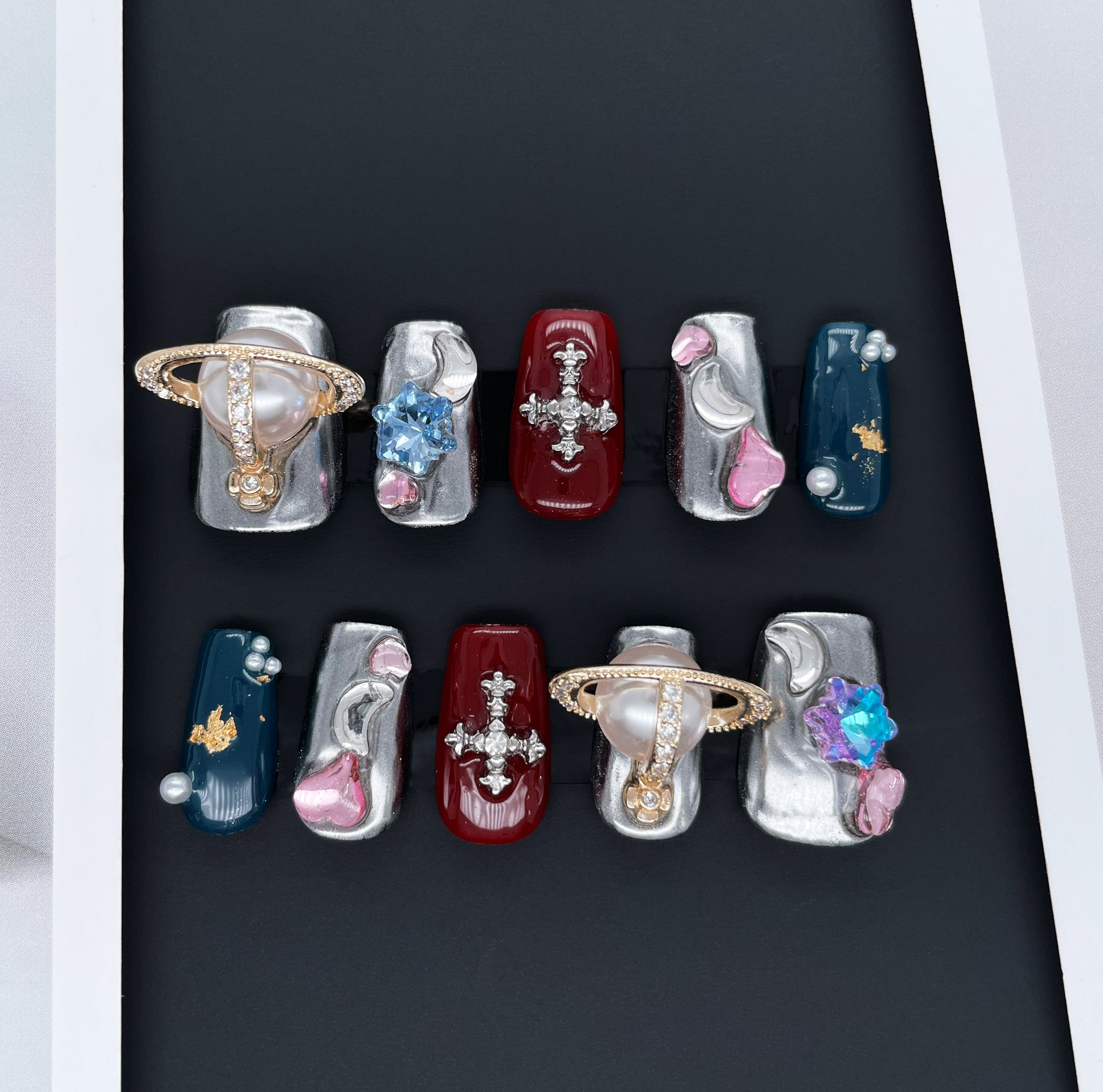 221 Vintage clolor cross metal silver diamonds giant pearl handmade 3D Press On Nails
